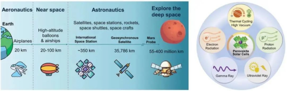 左:光伏技术在空间环境中的各种应用平台;右:空间环境中影响钙钛矿光伏电池性能的主要因素
