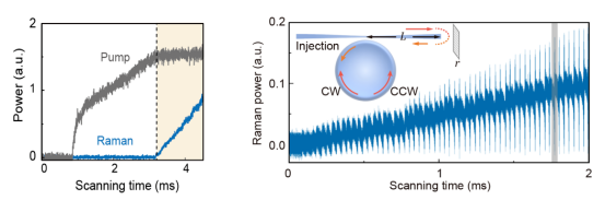 图2拉曼激光对腔内激发光的钳制效应(左)和时域上拉曼激光的周期性拍频信号(右)