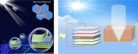 图1 PbI2与钙钛矿晶粒形成的自诱导I型能带排列(左)和光吸收(右)示意图
