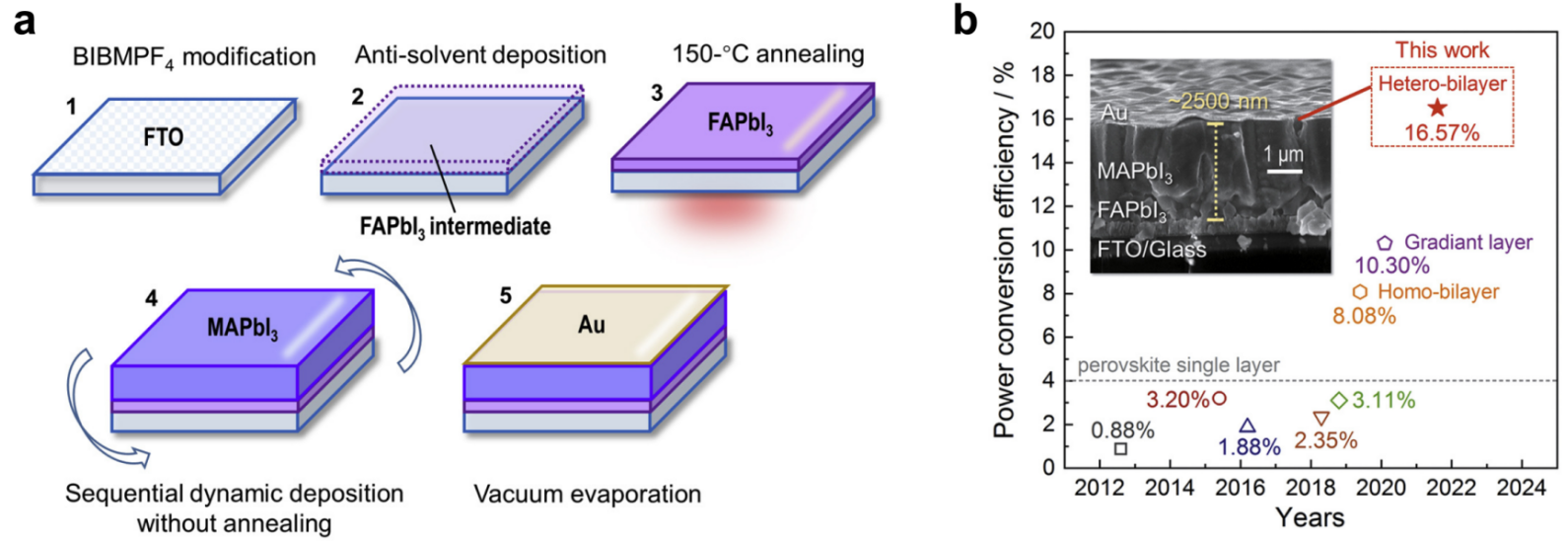 图1 (a)基于钙钛矿异质双层结构的无传输层钙钛矿太阳能电池器件制备流程图;(b)钙钛矿异质双层结构的截面电子扫描显微镜图片和无传输层钙钛矿太阳能电池效率进展图