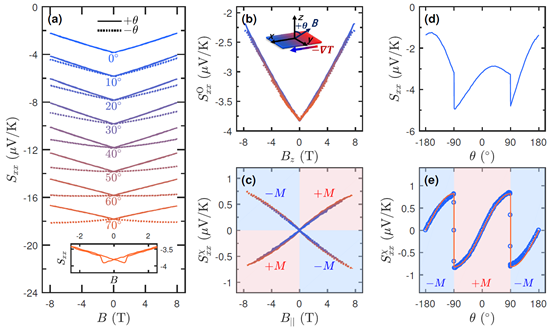 图(a)磁场偏离z轴时出现关于面内磁场反对称的塞贝克信号;(b)不同角度下的正常塞贝克信号;(c)不同角度下关于面内磁场反对称的塞贝克信号,磁化翻转时该信号也反号;(d)固定磁场在yz面旋转时塞贝克信号的角度依赖;(e)通过反对称得到的关于面内磁场反对称的塞贝克信号