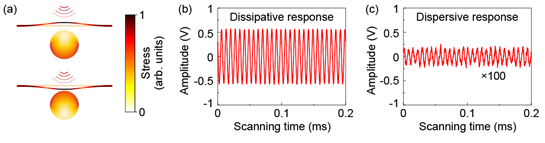 图1(a) 微腔-悬臂梁光纤耦合体系中的耗散型光声相互作用;(b) 声波耗散型响应时域测量结果;(c) 声波色散型响应时域测量结果