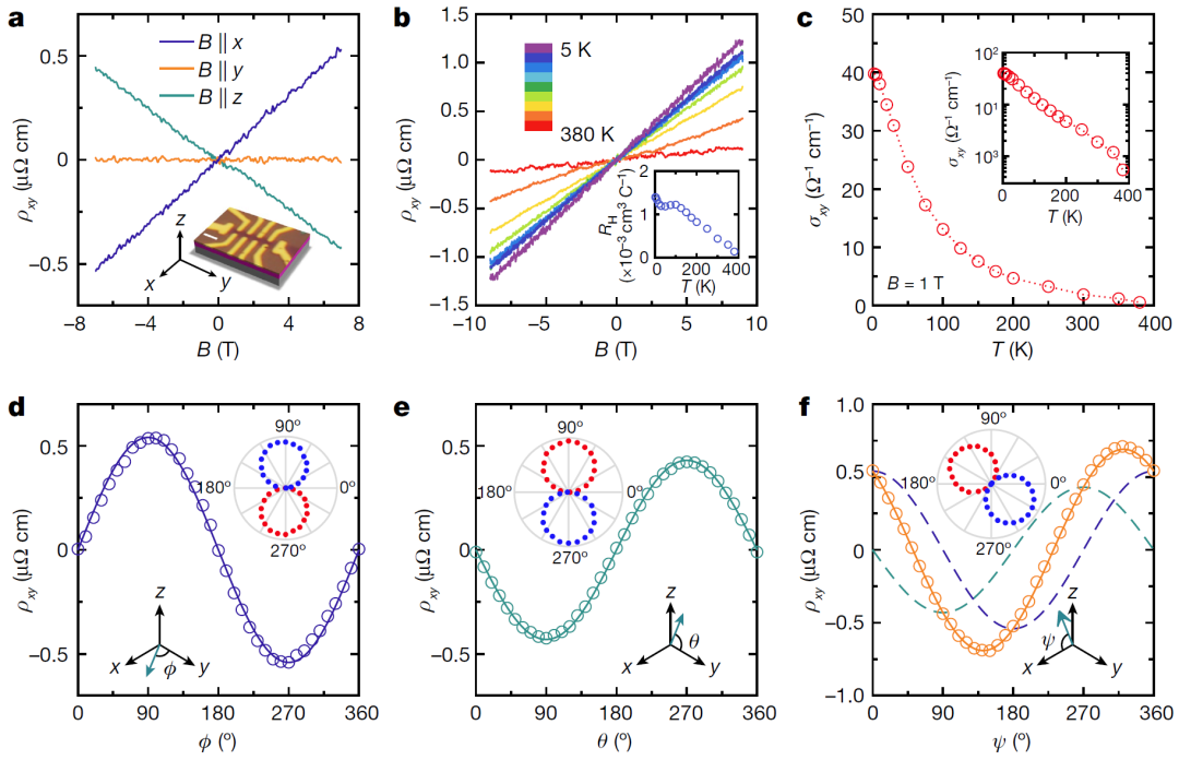 图2 VS2-VS超晶格的输运测量及面内反常霍尔效应:a.磁场沿不同方向的霍尔效应;b.不同温度下的面内霍尔效应;c.面内霍尔电导的温度关系;d~f.霍尔电阻随磁场方向的变化关系