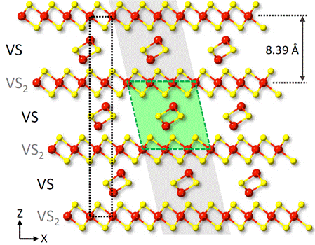 纳光电子前沿科学中心吴孝松研究员与北京理工大学物理学院周家东、姚裕贵教授,日本大阪大学Kazu Suenaga教授,新加坡南洋理工大学刘政教授等合作,合成了一种硫钒化合物(分子式为V5S8),并系统研究了其结构和电输运性质。他们发现,当磁场B在样品平面内时,这种材料表现出有悖于人们直觉的面内霍尔效应。进一步的透射电子显微镜结构分析揭示出,该材料具有新型的超晶格结构,即由二维VS2原子晶体和一维VS原子链阵列交替堆叠而成(图1);此异维结构有别于由不同材料的二维薄膜堆叠而成的传统超晶格结构,为未来超晶格材料开辟了新的设计思路。