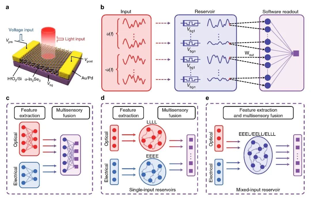 图1. α-In2Se3光电忆阻器与多模态、多尺度储备池计算