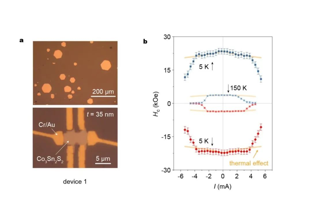 图1 a,Co3Sn2S2纳米片及霍尔器件的光学显微镜照片; b,当电流超过某一阈值时,器件的矫顽场快速下降,并且与热效应导致的矫顽场变化显著不同