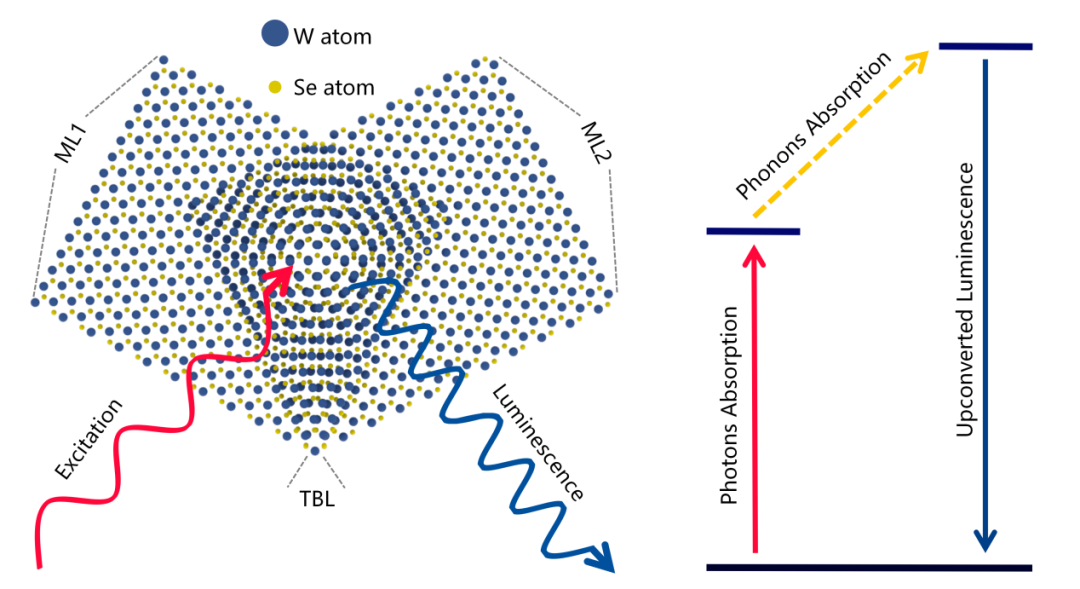 此外,TMD单层之间的弱范德瓦尔斯作用使其能与其他二维材料选择性堆叠,使得层间转角成为定制光电特性的新自由度。目前,在转角TMD中已经观察到了莫尔激子、莫尔极化激元、应变孤子和强关联态等全新的物理现象。然而,二维半导体层间转角影响声子辅助上转换的机制尚不清楚。