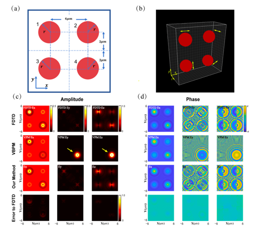 图2(a),(b)定义的四种晶体取向不同的小球。(c),(d)FDTD、VBPM和课题组提出的矢量模型计算得到的出射光场的Ex,Ey,Ez振幅和相位分布。