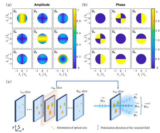 针对上述挑战,课题组提出一种全矢量、解析的双折射散射模型。该模型考虑了光场的矢量特性以及双折射物体的张量特性,通过引入偏振传递函数张量(PTFT, Polarization Transfer Function Tensor)概念,有效地描述了样品双折射导致的光场偏振改变以及矢量光场在传播过程中的自解偏现象。同时,该模型考虑了矢量光场在传播过程中的多次散射,将散射物体沿传播方向离散成等厚度薄片,每一层采用基于三维并矢格林函数的一阶Born近似计算得到出射场,计算得到出射场会继续参与下一层的散射,逐层进行传播可以得到整个三维空间内的矢量光场分布。如图1(a)和(b)分别为偏振传递函数张量的振幅和相位分布。图1(c)为矢量光场多层传播示意图。