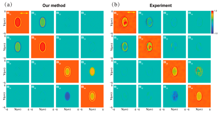 实验验证中,课题组合成了形状规则的单轴碳酸钙微球,并搭建了光镊辅助的偏振显微测试系统。通过光学捕获技术确定碳酸钙微球的晶轴取向,利用偏振显微系统测量双折射样品的Mueller矩阵,实验测量的Mueller矩阵与理论模型计算得到的结果吻合。同时,课题组探究了晶体取向对Mueller矩阵的影响,进一步验证了模型的正确性和准确性。成果提出的解析模型,将使得面向复杂偏振散射过程的研究中逆向解析重构成为可能,为复杂生物组织样品三维计算成像、端到端偏振光子设计以及偏振光场调控提供重要研究工具。