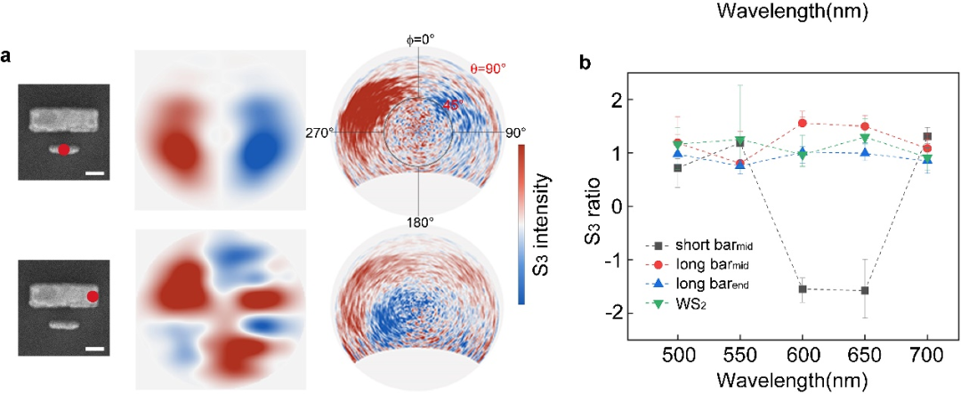 图2 (a) 电子束聚焦(聚焦位置由红点表示)在短棒中心和长棒端点时能谷激子辐射在远场的强度分布。(b) 能谷激子辐射在远场分离的定量描述。小于零的S3ratio代表了远场分离的状态。