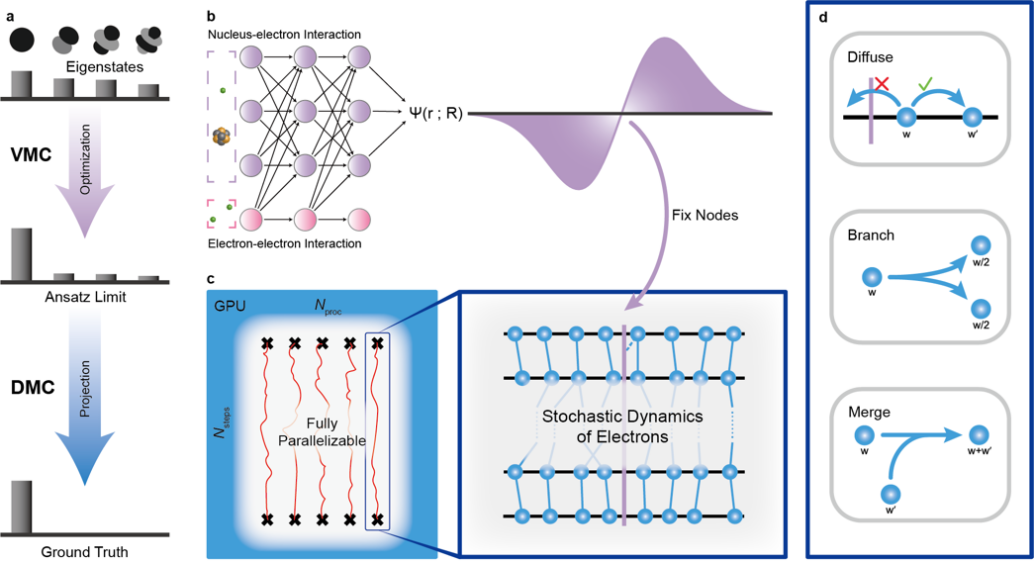 图1. a, VMC方法可以将波函数优化至接近基态,但由于函数模型表达能力有限,其精度存在一个上限。DMC方法通过虚时演化的方法将波函数向基态投影从而得以突破这一精度上限。b, 构建一个满足费米子交换反对称性的神经网络函数模型从而可以表示多体电子波函数。c, GPU友好、可高度并行化的DMC算法以及算法中游走子的随机扩散动力学简单示意图。d, DMC算法中的三个重要步骤:游走子的扩散、繁衍和湮灭。