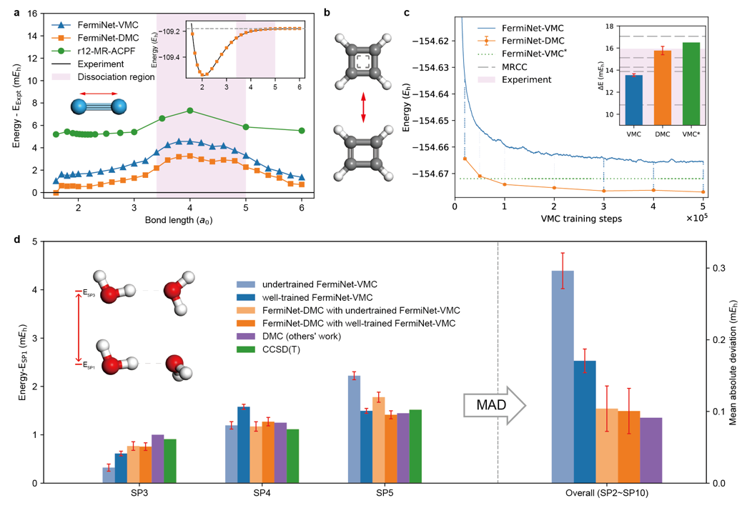 图2. 各类体系上的计算结果展示。a, 氮气分子的计算结果,其中蓝线为神经网络VMC方法,橙线为神经网络DMC方法,绿线为该体系上最精确的量子化学方法。b, 环丁二烯的平衡态构型(下)和过渡态构型(上)。c, 环丁二烯的平衡态构型计算曲线(主图)和转变势垒计算结果(小图)。d, 水二聚物团簇的不同方法计算结果。