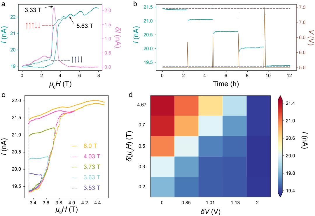在证实了CrOCl中的磁电耦合效应与反铁电结构的可调性之后,研究者将二者相结合,实现了电场调控磁相变。在外磁场下,CrOCl会从两上两下条状反铁磁结构相变到三上两下亚铁磁结构,该相变是一个具有巨大回滞的一级相变。在磁场从高到低的扫描过程中,样品会处于三上两下高电流态,而此时对隧穿结器件进行电场扫描,即可将器件设置到某中间电流态上。该电流态随时间无衰减,并且通过改变扫描电场的大小和速度即可改变电流的具体数值,实现任意连续阻态的数据写入。当施加的扫描电场足够大时,器件将回到两上两下低电流态。再继续进行磁场扫描即可擦除写入的信息,让样品回到三上两下高电流态。研究者通过改变磁场、电场扫描的具体数值,发现通过这两个自由度可以在一个μm2量级的器件中实现超高密度(大于十进制)、超低能耗(<10 A/cm2)的连续信息存储(图三)。而反复进行磁场和电压扫描,器件的阻态都能够稳定地复现,从而证实了该存储器件的稳定性。