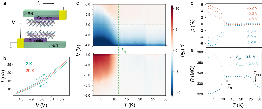 传统自旋电子学是以铁磁材料及其巨磁阻等效应为基础,通过外加磁场、电场等来测量并调控铁磁材料自旋极化的方向,从而实现数据的存储、运算和传输。近期一系列研究结果表明,相比于铁磁材料,反铁磁材料在自旋电子学应用方面具有抗干扰、无漏磁、操作速度快等更多优秀的特性,是发展新一代自旋电子学器件极有潜力的材料体系。然而,反铁磁材料的零磁矩也为其信息的写入造成了巨大困难,在铁磁材料中常用的自旋转移力矩、自旋轨道力矩等手段很难在反铁磁材料中实现有效的磁矩翻转。因此,如何用电信号调控反铁磁材料的磁相变,是目前自旋电子学领域最重要并具挑战性的问题之一。