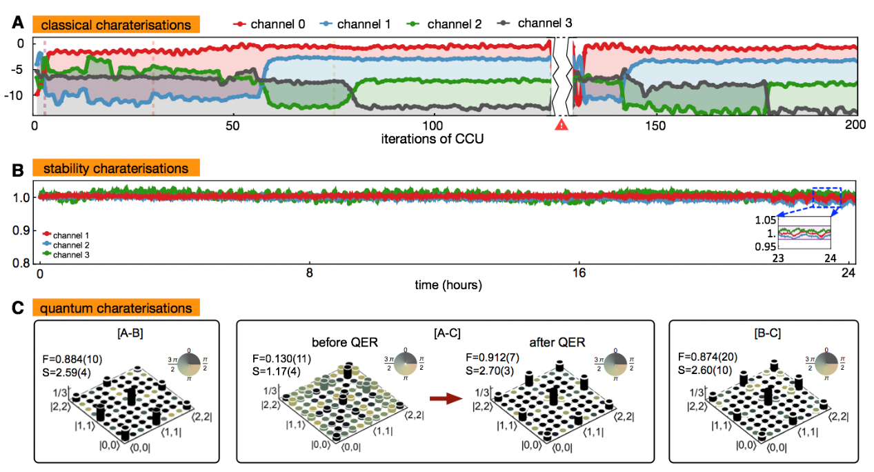 图3. 高维量子纠缠恢复(A)、系统稳定性测试(B)及多芯片间量子纠缠分发(C)。