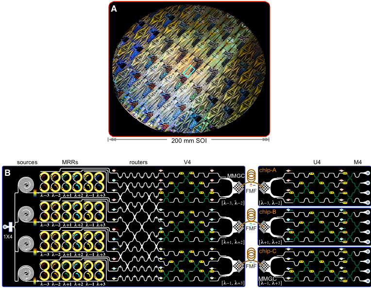 针对高维量子网络发展需求,研究团队创新设计了具有大容差、大带宽等优异特性的硅基光量子器件,并发展了光量子芯片晶圆级制造工艺,成功研制了宽带量子光源、波分复用高阶微环阵列、任意可编程光量子线性网络、路径-偏振-模式相干转化的多模波导光栅等核心器件,且具有晶圆级高一致性和高扩展性,展现了构建大规模网络的突出潜力。基于此,团队进一步实现了高全同、可扩展的量子网络中心芯片和量子节点芯片(图2A-2B)。