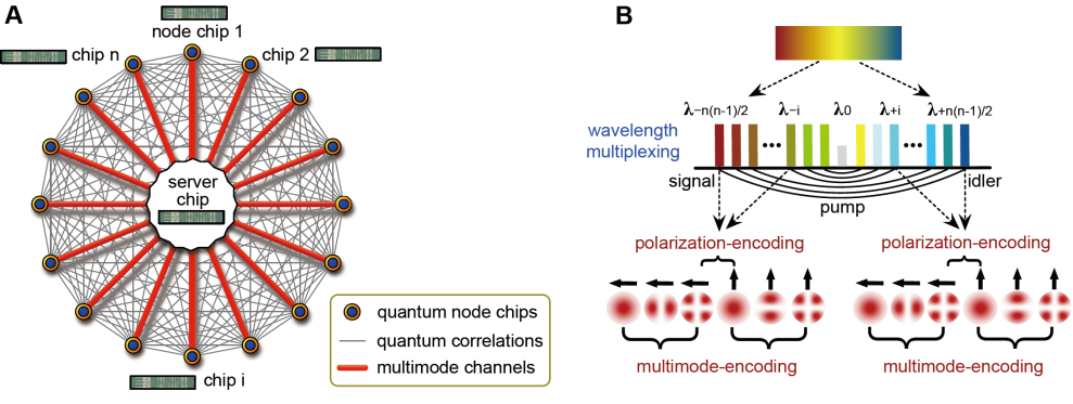 图1A为多芯片高维度量子纠缠网络架构示意图。对于一个n用户(图1A顶点)的全连接量子网络,需要n(n-1)/2个具有量子关联的光子对来进行连接(图1A灰色边)。利用片上多维混合复用技术,d维的纠缠光子对可以由光子的横向模式和偏振自由度进行混合编码(图1B),并通过波分复用技术在一根多模光纤信道中(图1A红色边)复用n-1组光子。在该网络中,多个纠缠光子对的同时分发由波分复用技术来实现,而芯片间高维纠缠态相干传输则通过片上路径编码以及多模光纤偏振-模式混合编码来实现。