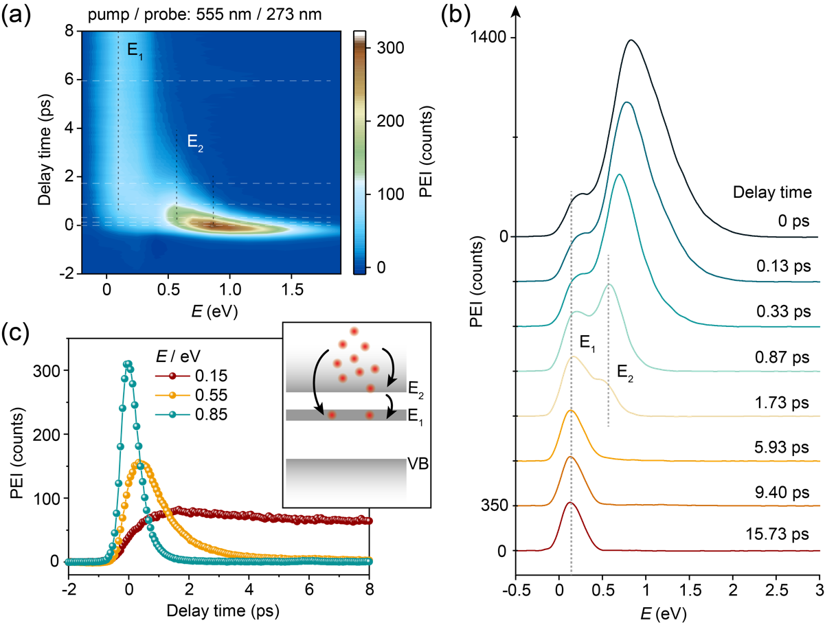 为确认猜想,研究团队进一步结合能量分辨光电子显微镜得到碲纳米片中激发态电子的时间变化能谱。在555 nm激光泵浦下的时间变化能谱中可以明显看到两个分立的能级E1和E2(图3)。在前1 ps中,被激发到高能级导带的激发态电子冷却到低能级,因而时间变化能谱的高能峰在前1 ps发生明显的红移。为了更加准确地得到各个导带能级上电子弛豫的快慢,研究团队提取了0 ps时的高能峰以及两个子带上的激发态电子数量变化曲线,得到了0.3 ps左右的超快热电子冷却过程、大约1 ps左右的电子带间跃迁过程以及百ps量级的慢弛豫过程。考虑到Gamma点并不是导电的最低点,慢过程可能由于是电子辐射复合回到价带或者是向更低导带能级散射。该实验系统的时间分辨能力大约是200 fs,能量分辨能力大约是150 meV。