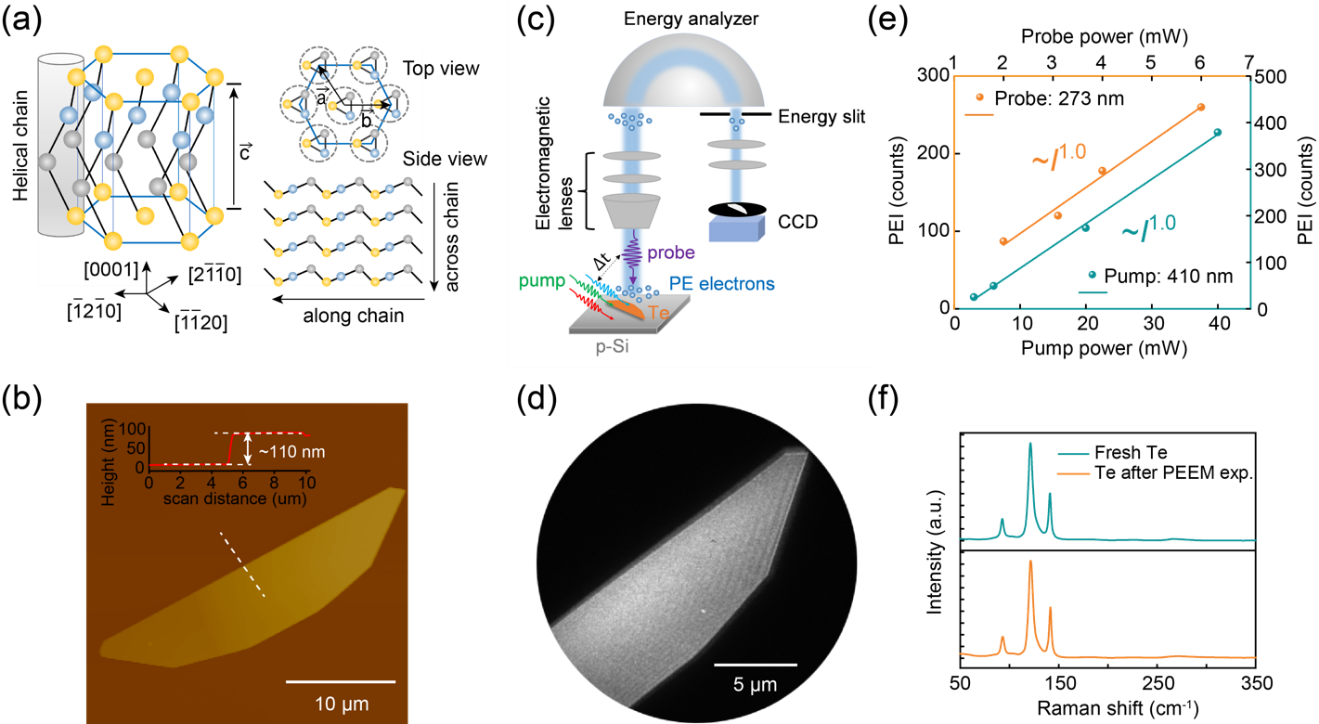 飞秒-纳米时空分辨光电子显微镜因其超高时空分辨能力常被用于材料的超快动力学研究,探索载流子动力学对理解材料的物化性质以及器件应用起到关键作用。随着各种新型二维材料的出现,以硼烯、硅烯、磷烯等为例的单元素二维材料以其奇特的光电特性以及广泛应用前景在近年来受到大量关注。其中,具有手性链结构的二维单元素半导体碲纳米片具有独特的电子结构以及拓扑性质,基于其的场效应晶体管、调制器以及光探测器等器件也已经被实现,理解二维碲纳米的载流子动力学对其基础研究以及器件应用具有关键作用。