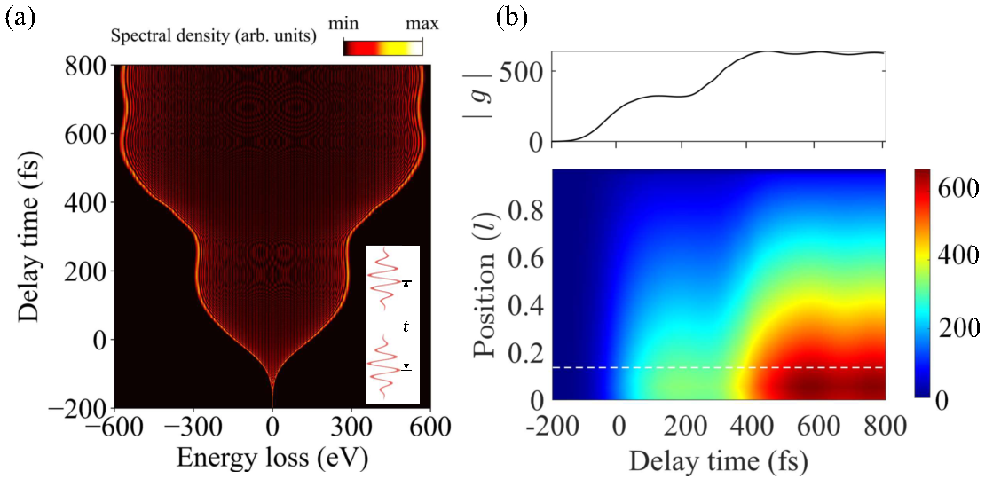 图2 (a) 自由电子与被两个相隔时间t的激光脉冲激发的拓扑纳腔相互作用后的能量损失谱图;(b) 相互作用系数随着电子脉冲与第一束激光脉冲间的延迟时间变化图。