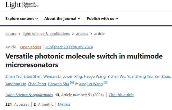 近日,中心王兴军、舒浩文团队提出集成微波光子宽频段精细信号处理解决方案,通过操控波导内空间模式的耦合关系来调控谐振峰劈裂的状态;当劈裂调控至消失时,谐振峰宽仅约30 MHz,同时维持着超百GHz的自由光谱范围,为高精度、超宽带的微波光子应用提供了强大支持。团队实现了基于硅基微环的跨L, S, C, X, Ku, K, Ka, U多频段的微波/毫米波的生成与处理,对于未来机载、卫星的跨频段无线通信具有重要意义。2月20日,相关研究成果以《多模微环谐振器中的多功能光子分子开关》(“Versatile photonic molecule switch in multimode microresonators”)为题,在线发表于Nature子刊《光:科学与应用》(Light: Science & Applications)。