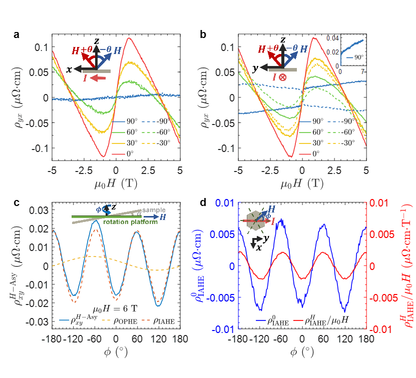 图1 a,b 霍尔效应在磁场/磁化打破镜面对称性时出现,面内反常霍尔效应(插图)由与磁化相关的跳变(斜散射机制主导)和与磁场相关的线性依赖(磁非线性反常霍尔效应)两部分构成。c,d 面内反常霍尔效应呈现120°周期性,区别于正常霍尔效应的行为,同时符合晶体对称性的要求。