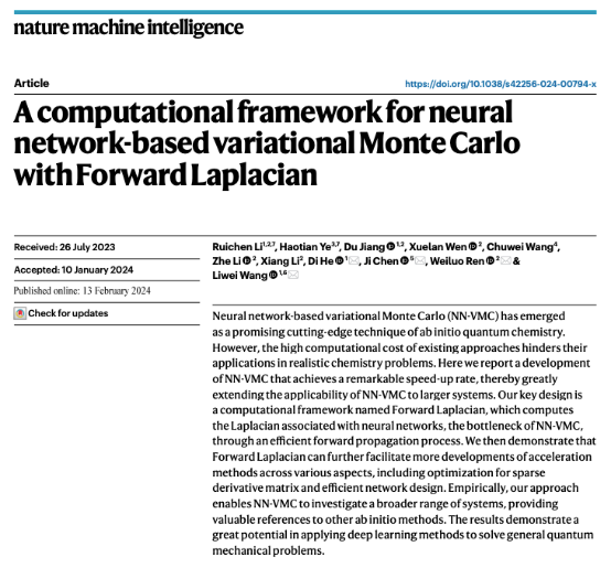 中心陈基课题组与智能学院王立威贺笛课题组、字节跳动研究部门合作,使用深度学习技术求解薛定谔方程取得重要进展。在这项工作中,研究团队针对基于神经网络的量子变分蒙特卡洛算法(NNVMC),设计了全新的高效计算框架“Forward Laplacian”和相匹配的高效神经网络模型LapNet。所提出的方案在完全不损失计算精度的前提下为NNVMC方法带来了十倍以上的加速,显著地扩展了该方法的适用范围,并为其它精确计算方法提供了宝贵的参考。相关研究成果以“A computational framework for neural network-based variational Monte Carlo with Forward Laplacian”为题,于2024年2月13日发表在《自然-机器智能》(Nature Machine Intelligence)。