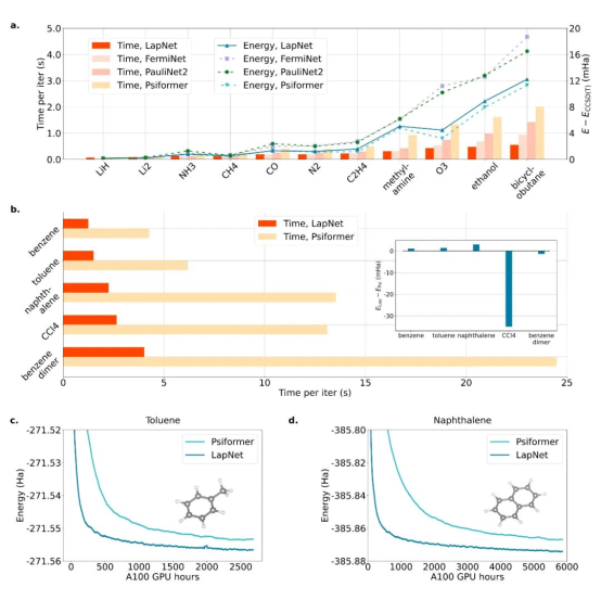 LapNet相对FermiNet、PauliNet2、Psiformer,在若干分子体系上显著提升精度