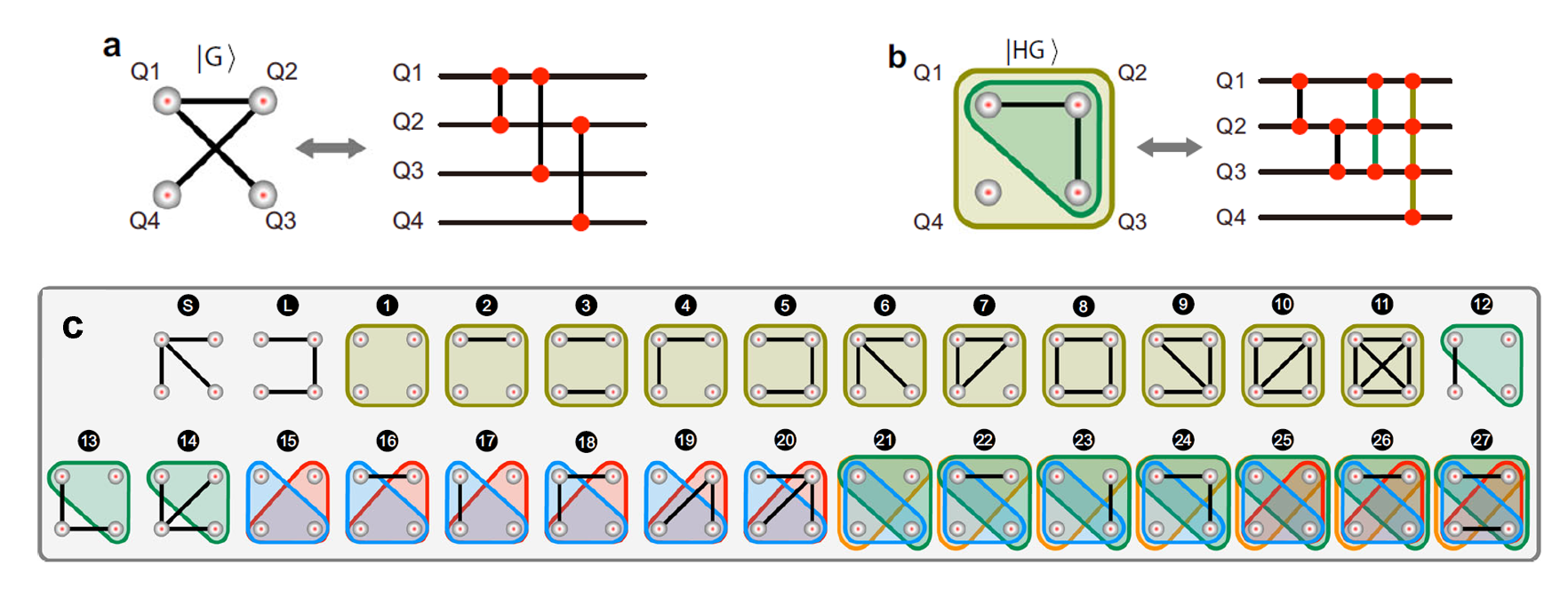 图1. 量子图态与量子超图态的定义。(a)量子图态,(b)量子超图态,(c)四比特量子超图态的完备分类。