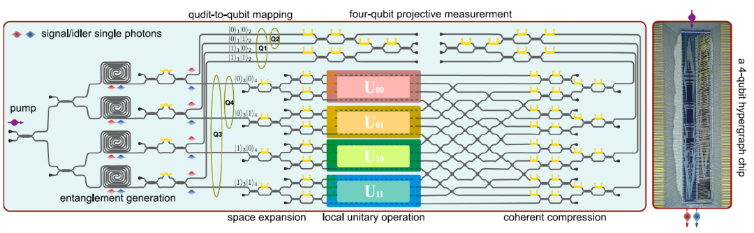 近日,中心王剑威研究员和龚旗煌院士团队在硅基集成光量子芯片上演示了基于超图态的量子信息处理与量子计算。研究团队在硅基可编程光量子芯片上发展了态空间等价方法,实现了完备四比特超图态(27类超图态+2类图态)的芯片上制备、调控、测量与实验判定,演示了基于测量超图态的通用量子计算基本操作,验证了基于超图态的盲量子计算功能。2024年3月23日,相关研究成果以“基于超图态的量子信息处理”(Demonstration of hypergraph-state quantum information processing)为题,发表于《自然·通讯》(Nature Communications)。