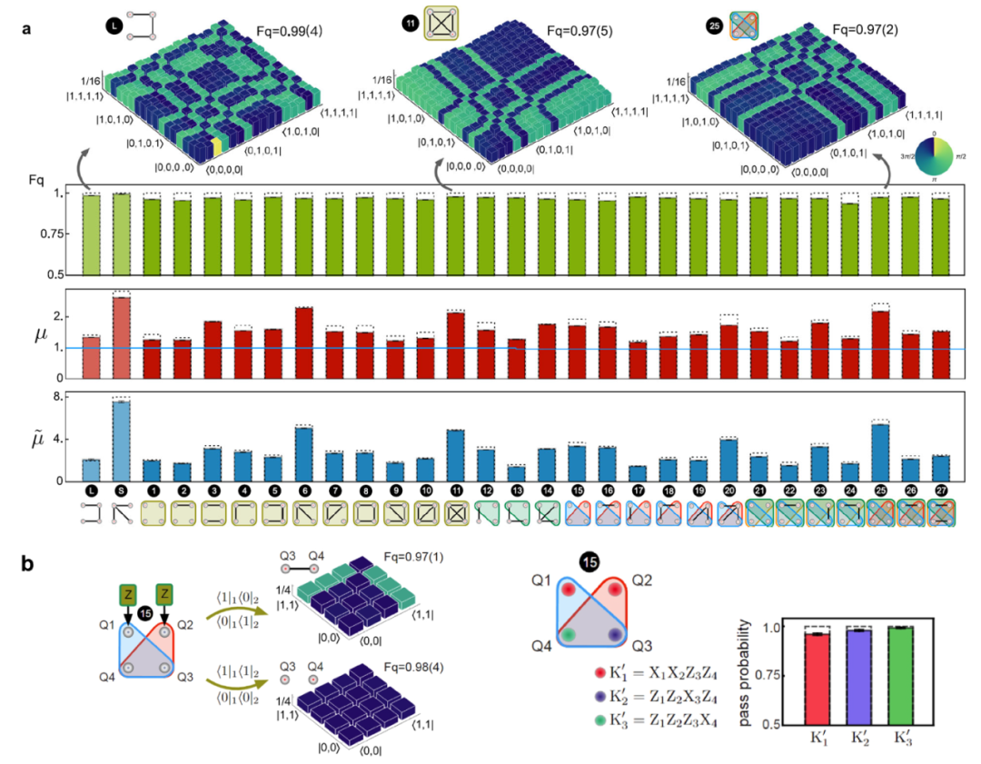 在该项研究工作中,研究团队发展出了一款硅基可编程光量子芯片(图2),通过希尔伯特态空间等价的方法,在实验上展示了对图1c中四比特完备超图态(基于局域幺正变换等价性)的制备、调控、测量与实验判定。实验中通过量子态层析、量子纠缠见证和Mermin不等式违背等实验,验证了所有27+2类超图态的高保真度制备和纠缠特性(图3a)。基于高保真制备的超图态,进一步在实验上演示了基于测量超图态的盲量子计算功能(图3b),包括:利用泡利测量进行超图态调控,颜色编码与验证。本工作展示了量子超图态作为量子图态的拓展,具有更加丰富的纠缠特性,有望应用于新型量子信息处理与通用量子计算。