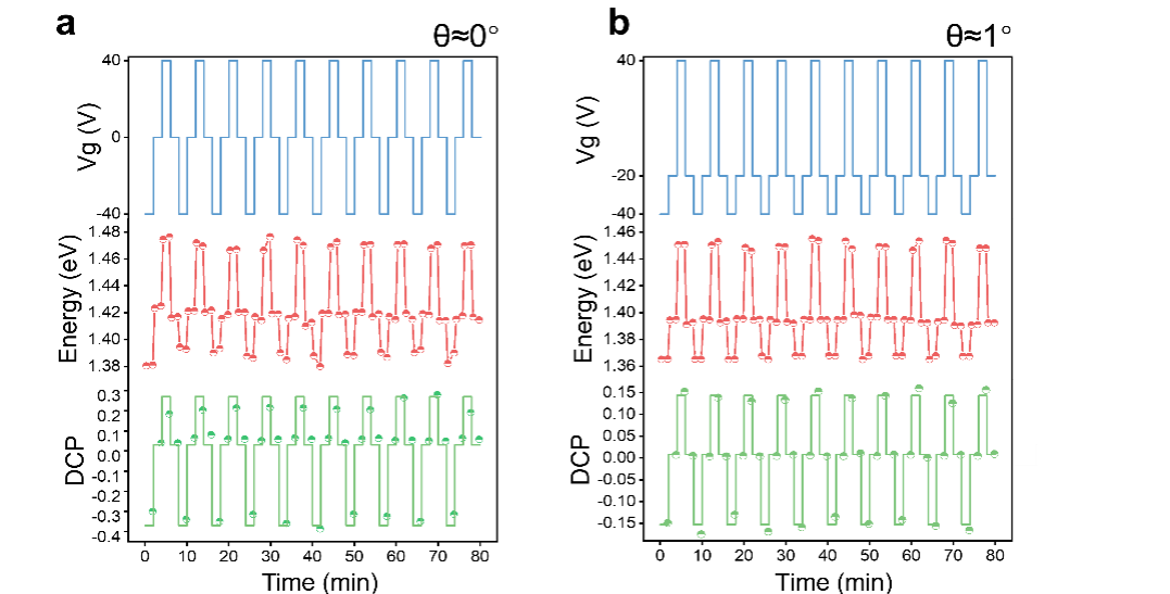 图3. 电控转角异质结构中的谷编码。(a-b) 周期性偏置电压(蓝线)下器件θ≈0°(a)和θ≈1°(b)的IXs发射随时间变化的能量(红点)和DCP(绿点)。