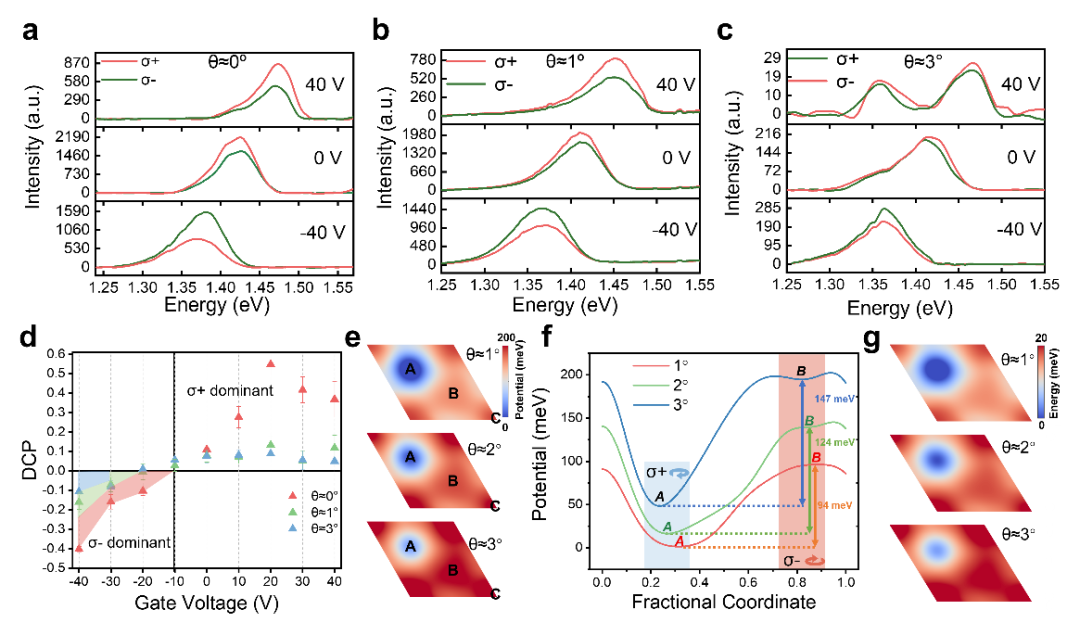 图1. 转角依赖的极化性质。(a-c) θ≈0°、θ≈1°和θ≈3°时- 40、0和40 V的偏振分辨PL光谱 (T = 10 K)。(d) 三个转角器件IXs的DCP随栅压的变化。(e) 不同扭转角度下的激子势能的等高线图。(f) 图(e)的对角线扫描曲线及摩尔激子的层间光学选择定则。(g) 层间e-h交换能的等高线图。