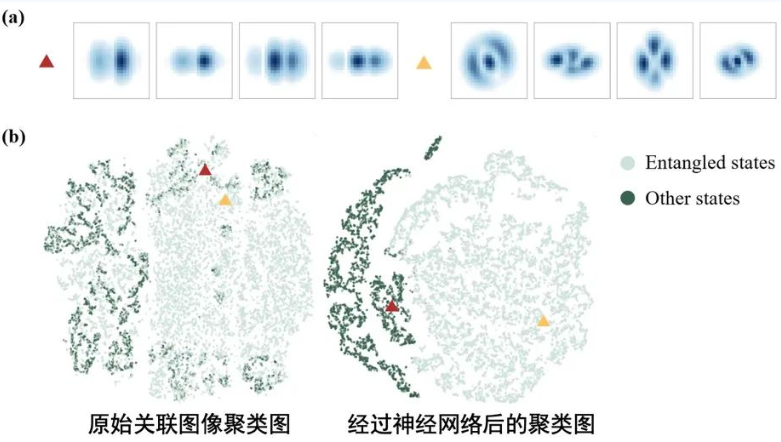 图2. (a) 降维前的两组双模量子态的关联图像。每个量子态有四幅图,降维处理后,四幅图被整合并映射成了图(b)可视化空间中的一个点;(b) 15000组双模量子态关联图像经过数据降维后的聚类图像,其中浅绿色点代表纠缠态的关联图像,深绿色点代表非纠缠态的关联图像,散点距离越近即关联图像的相似程度越高。左:未经过神经网络的原始关联图像聚类;右:经过神经网络之后,关联图像的聚类。