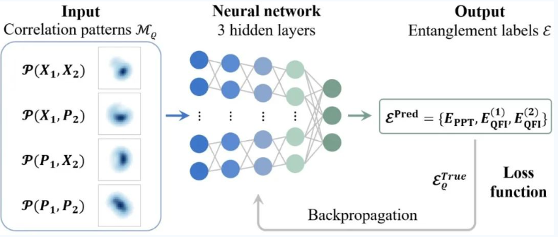 图1. 神经网络训练过程示意图。包含量子态纠缠特性的关联图像(Correlation patterns)与量子态纠缠判据计算结果(Entanglement labels)作为“特征-标签”对,被同时注入神经网络进行训练。神经网络内部参数通过多次反向传播(Backpropagation)迭代更新,最终建立起从关联图像到纠缠结果的映射关系。