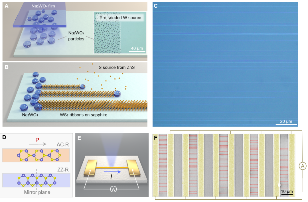 图1:具有可控手性与相干极性WS2条带阵列制造及自发光电流集成输出