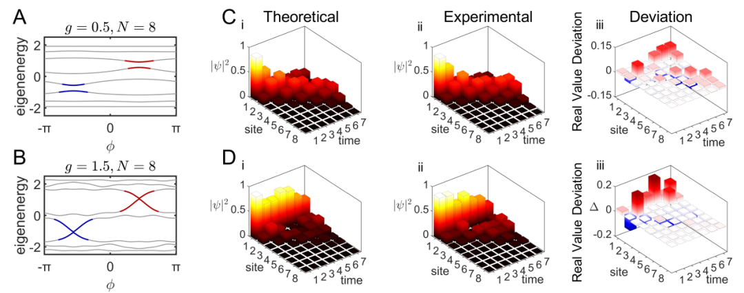 图3. 一维AAH拓扑绝缘体量子态演化的模拟结果。(A-B)两种拓扑相下以起始相位作为合成维度的准能带。(C-D) 两种拓扑相下量子模拟的理论结果和实验测量结果。