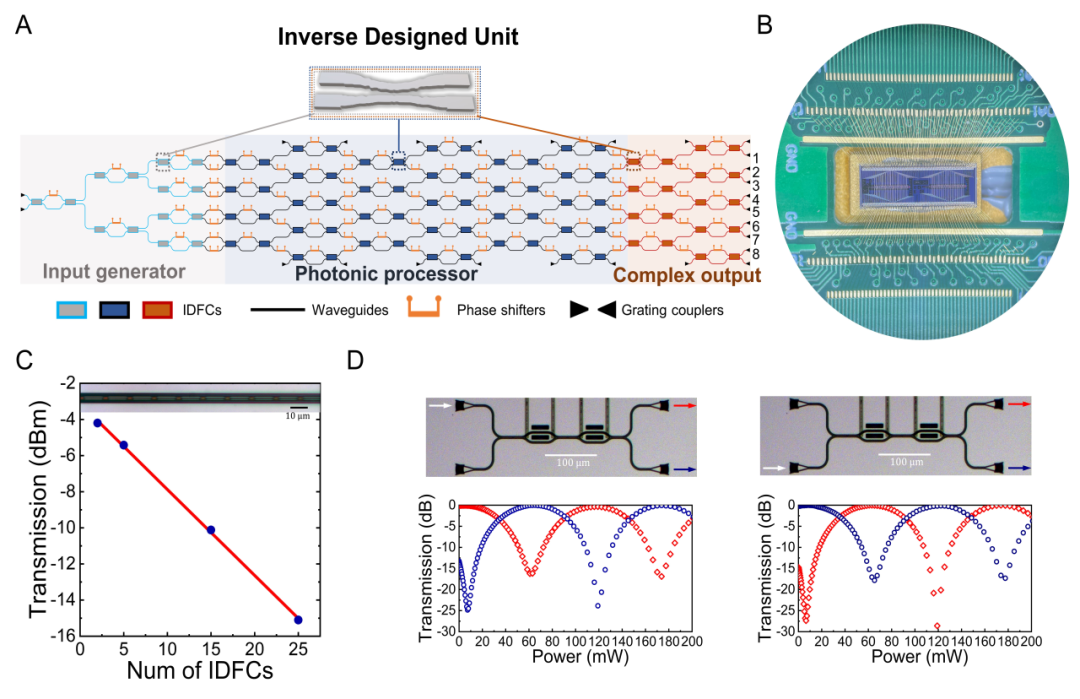 图1. 芯片结构图以及单元结构测试结果。(A)芯片结构示意图,芯片由输入态制备部分、信息处理器和输出部分组成。(B) 封装后的芯片照片。(C) 若干定向耦合器串联透射率拟合结果。(D)由两个逆向设计的定向耦合器和一个电极组成的新型MZ干涉仪的透过率随着电极上所加功率的变化曲线。