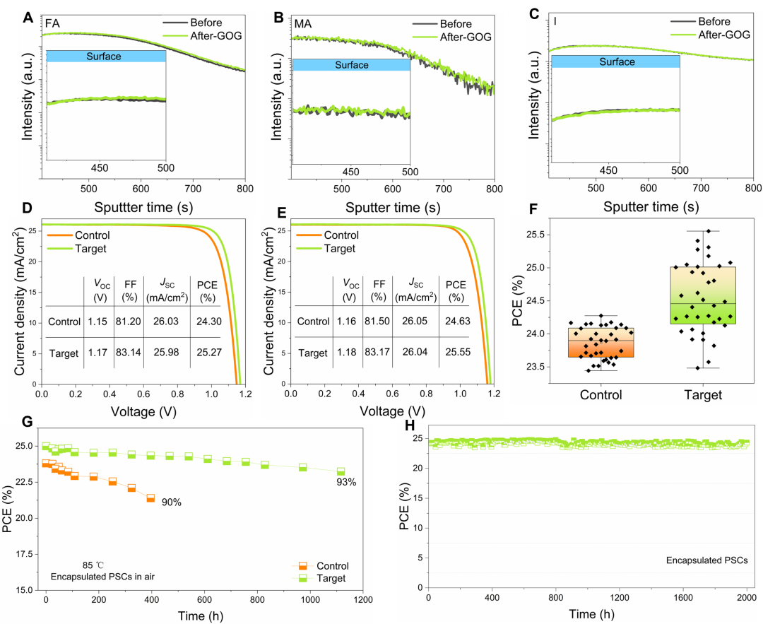 为解决这一关键问题,课题组提出通过插入较厚保护层来削弱电极制备过程对钙钛矿薄膜影响的策略,巧妙设计了一种由氧化石墨烯和天然石墨薄片构成的双层结构来作为钙钛矿薄膜的保护层。一系列对钙钛矿薄膜的表征结果表明该保护层可以确保钙钛矿膜在电极制备前后的成分和光电性质的一致性。质谱结果证明在电极制备前后,钙钛矿薄膜的所有组分几乎保持不变(图3a-c)。最后,通过添加该保护层降低电极制备过程造成的薄膜损伤,将钙钛矿太阳能电池的光电转换效率从24.63%显著提升到25.55%(图3)。此外,实验结果还证实了该保护层同时有利于提升薄膜的水氧、光热稳定性和对抗离子迁移方面的稳定性。封装的器件在85 ℃加热老化1100小时后仍能保持初始效率的93%,在最大功率点跟踪2000小时后表现出基本不变的优异稳定性 (图3)。上述结果验证了添加该保护层可消除电极制备前后造成的薄膜不一致性,有望将薄膜优化最大化贡献于最终器件光伏性能的提升。