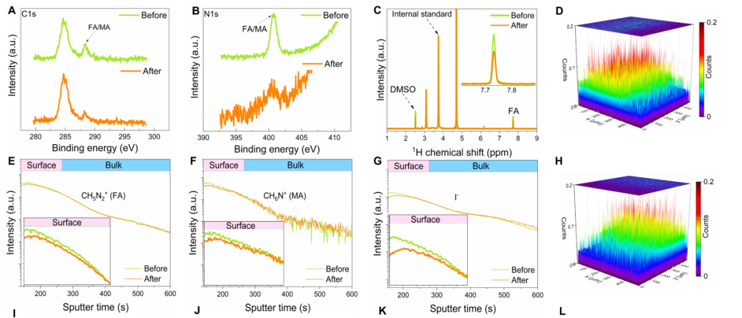 有机无机杂化钙钛矿材料作为一种新型高效廉价的光伏半导体,将助力我国更好地实现碳中和目标。钙钛矿作为新兴半导体,其材料及器件的主要制备和表征方法都借鉴于传统半导体。但是钙钛矿具有与它们截然不同的晶体特性,例如明显较弱的化学键和较软的晶格等,因此这些常规方法例如高真空热蒸发制备金属电极过程等是否仍然完全适用于钙钛矿需要深入探索。这些过程是否会导致最终工作于器件中的薄膜和预先优化的薄膜是不一致的?薄膜优化是否可以完全贡献于最终器件性能的提升?这些问题很少受到领域的普遍关注。该研究首先通过一系列表界面表征方法对新鲜制备的电极和钙钛矿薄膜进行了测量和表征(图1),证实了钙钛矿薄膜表面在电极制备过程中发生了组分逃逸和部分降解。