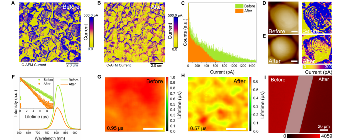 进一步通过导电AFM揭示出电极制备过程削弱了钙钛矿薄膜表面的导电性(图2),光学测量表征显示出电极制备过程导致钛矿薄膜表面的缺陷密度增加,载流子寿命下降。共聚焦激光扫描显微镜观测到同样的变化规律。后续对薄膜厚度相关的时间分辨光致发光衰减动力学表征结果表明,电极制备过程提高了钙钛矿薄膜的表面复合速率而对体复合寿命的影响相对较小,进一步说明电极制备主要恶化了钙钛矿薄膜表面,从而对后续器件性能造成影响。