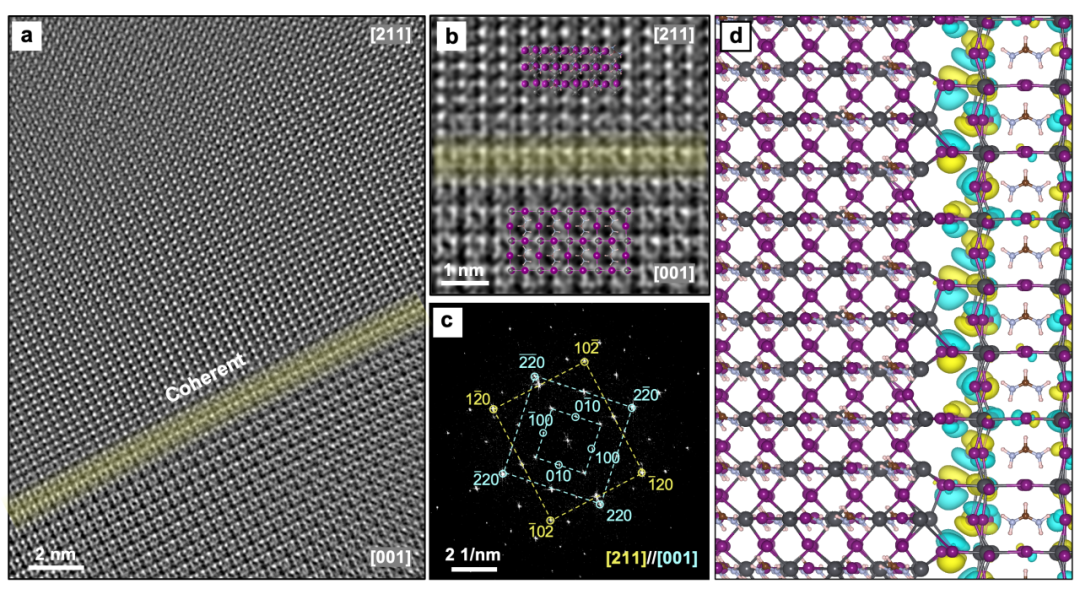 图2.原子尺度高分辨率冷冻透射电子显微镜(Cryo-TEM)图像及相干晶界。(a)钙钛矿[211]晶带轴与[001]晶带轴轴之间相干晶界的高分辨冷冻电镜图像;(b)相干晶界的放大图;(c)对应的快速傅里叶变换(FFT)图案;(d)相干晶界的理论原子模型。