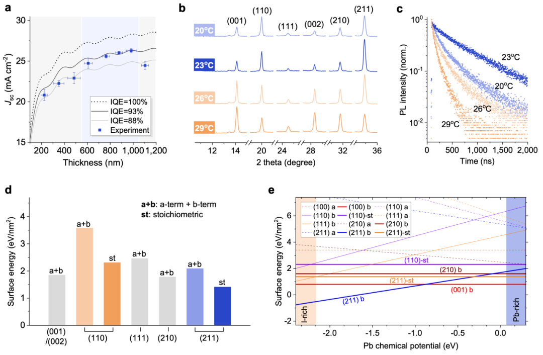 图1.调控高密勒指数晶面及相关机制。(a)短路电流密度随钙钛矿薄膜厚度变化的理论与实验值;(b)微米厚钙钛矿薄膜的X射线衍射图谱;(c)时间分辨光致发光谱;(d)DFT计算得到不同晶面取向钙钛矿的表面能;(e)不同化学势条件下的表面能。