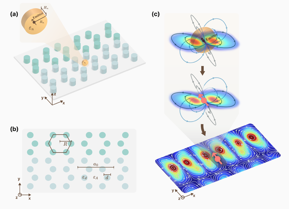 图2 (a)拓扑光子晶体—共振纳米圆盘复合结构示意图。(b)蜂窝光子晶体结构示意图。(c) 由磁量子发射器(棕色箭头)激发的纳米盘的磁偶极子共振可以等效成大磁偶极子(粉色箭头)。纳米盘和等效磁偶极子周围的流线是磁场线。底部是边缘态的电场分布,白色流线是磁场线。