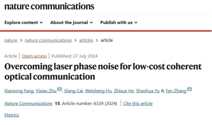 近期,中心张帆教授课题组与上海交通大学电子工程系未来光网络团队、鹏城实验室研究团队合作,在相干光传输领域取得重要进展,研究成果以“Overcoming laser phase noise for low-cost coherent optical communication”为题,发表在《Nature Communications》期刊上。该研究成功解决了相干光通信系统中激光器相位噪声影响这一基本问题,为实现高速、低成本的相干光通信技术提供了有力解决方案。