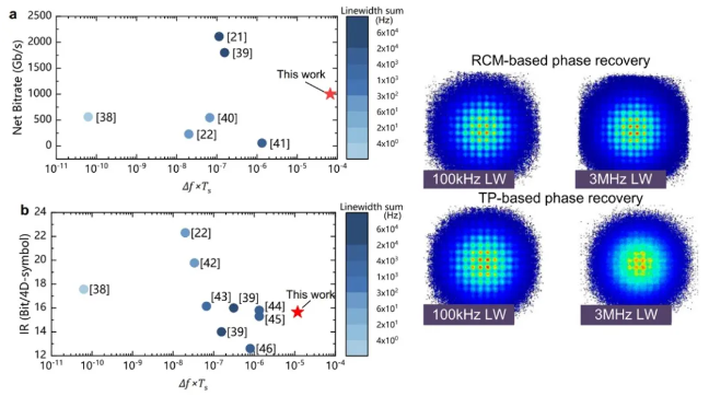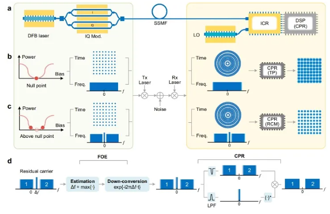 为解决相位噪声对相干光通信系统的影响,联合研究团队创新性地提出了一种残余载波调制(Residual Carrier Modulation, RCM)技术,使用低成本、大线宽激光器实现了高速、高谱效率相干光通信系统。该技术通过在数字域内对信号和残余载波进行拍频,有效提高了相位噪声的跟踪能力,显著提升了系统性能。