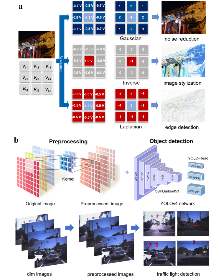 在此基础上,研究团队设计构建了可重构的MAPbI3/Bi2O2Se异质结光电晶体管型视觉器件,利用能级动量守恒增强的光生热电子输运,实现了高灵敏、宽光谱的正负双极光电响应,其中,正负双极型光响应度达到±107A/W,比探测率达到 5.2×1011Jones ,动态范围达到 110 dB,处于国际领先水平;进一步,制备了异质结晶体管阵列,在亮度低至 0.1 𝜇W/cm2的月光环境下,仍然能够有效执行高斯、拉普拉斯和逆算子等光电感内卷积运算,完成弱光图像传感与预处理(图3a);最后,异质结晶体管阵列与 YOLOv4 神经网络结合,对比不同光响应度阵列在弱光条件下的图像感知识别能力,表明高灵敏度MAPbI3/Bi2O2Se异质结具有强抗噪能力,能够在更短训练周期内实现更高的弱光目标识别准确度,为推动高灵敏视觉系统及其应用提供了有效可行的方案(图3b)。