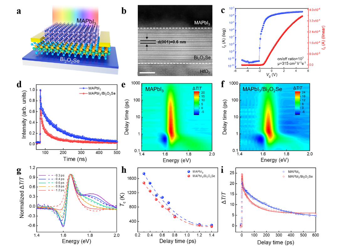 首先,研究团队通过第一性原理计算,解析了卤化物钙钛矿MAPbI3与Bi2O2Se的电子能级结构,发现MAPbI3的导带底和价带顶与Bi2O2Se的导带底都位于布里渊区的Γ点,揭示了二者之间的能级动量守恒特性(图1b-e);进而,合成了高质量的MAPbI3/Bi2O2Se薄膜异质结,利用变温光致发光谱扫描,验证了光生热电子能够直接从MAPbI3跃迁至Bi2O2Se,极大地提高了光生热电子输运;最后,利用飞秒瞬态吸收光谱,成功追踪了光生热电子在异质结界面的输运动力学,深入解析其物理机制 (图2)。