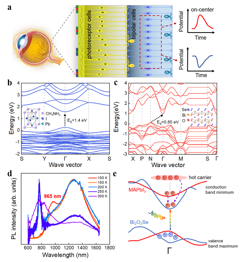 图1. (a)生物视觉感知机制;(b)MAPbI3与Bi2O2Se能级动量守恒。